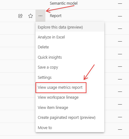 2 -Then go the report you want to check the views (or any in the workspace really) and click on ‘More options’ -> ‘View usage metrics’